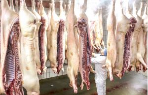 Metzger zerlegt eine Schweinehälfte in einer professionellen Fleischerei, steht mit scharfem Messer am Schlachttisch, trägt Schutzkleidung und Schürze, frisch geschlachtetes Schwein, handwerkliche Fleischverarbeitung, Metzgerei-Arbeitsplatz, traditionelle Fleischzerlegung.